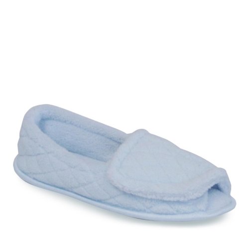 ComfortFit Women's Micro Chenille Adjustable Slippers softly wrap your feet with a customized fit This slipper offers easy adjustability, making it a great choice for swelling, edema, bunions and post-surgery foot care. The soft, quilted micro chenille upper features a hook-and-loop closure that opens completely and ensures a comfortable fit for any foot shape. The footbed is padded with memory foam cushioning to soften your steps, and a slip-resistant outsole helps keep you steady, whether indoors or out.
